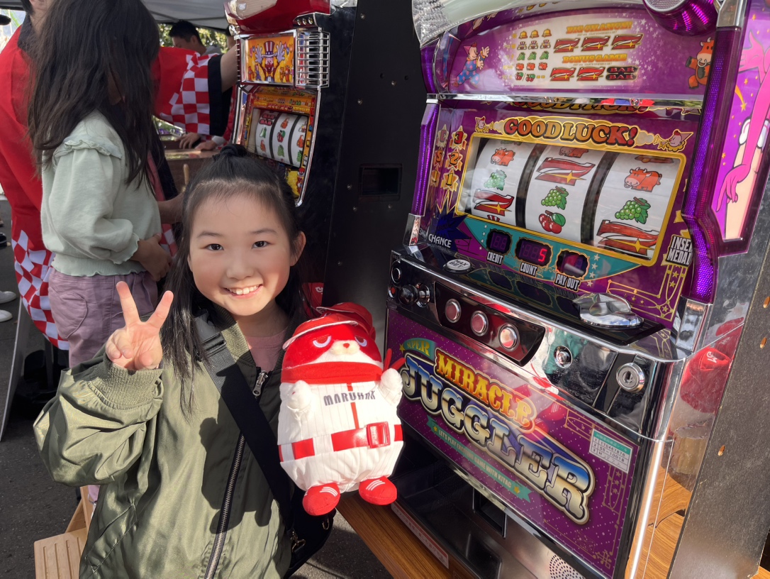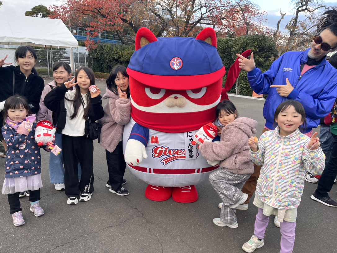 今回、マルハンからは16名が参加。ブースではスマートボールやスロット体験のほか、にゃんまるグッズの配布やお菓子のつかみ取りなどを実施しました。にゃんまるが登場すると、子どもたちはもちろん大人も笑顔に。列が20分待ちになるほどの盛況ぶりで、会場のあちこちに笑顔の輪が広がりました。