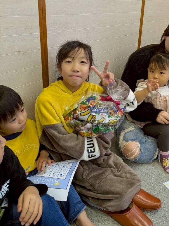 当日は、スタッフ6名が参加し、にゃんまると一緒にビンゴ大会や○×クイズを実施しました。30分という限られた時間ではありましたが、ビンゴ大会では会場が一気に盛り上がり、後半には次々とビンゴが出る展開に。スタッフも声を掛け合いながら、にぎやかな進行となりました。ビンゴを達成した子どもたちは、大小さまざまなお菓子パックの中から好きなものを選び、その場で開封して楽しむ姿も見られました。にゃんまるの登場に、喜ぶ子どもたちの声が会場に広がりました。