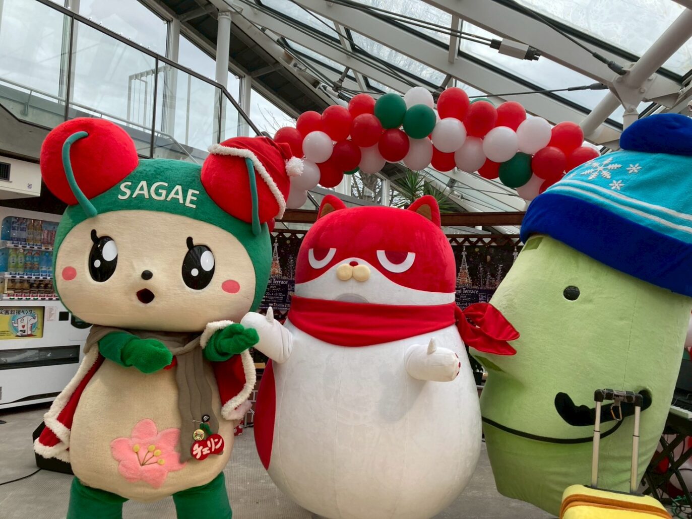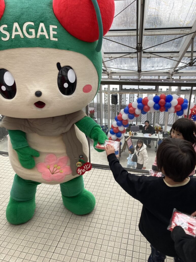 また、寒河江市のご当地マスコットキャラクター「きてけろくん」や「チェリン」と、にゃんまるの交流も実現。キャラクター同士の共演により、会場はさらに和やかな雰囲気に包まれました。運営の方のご協力により、チェリンがお菓子配布を行う場面もあり、多くの来場者の笑顔につながりました。
