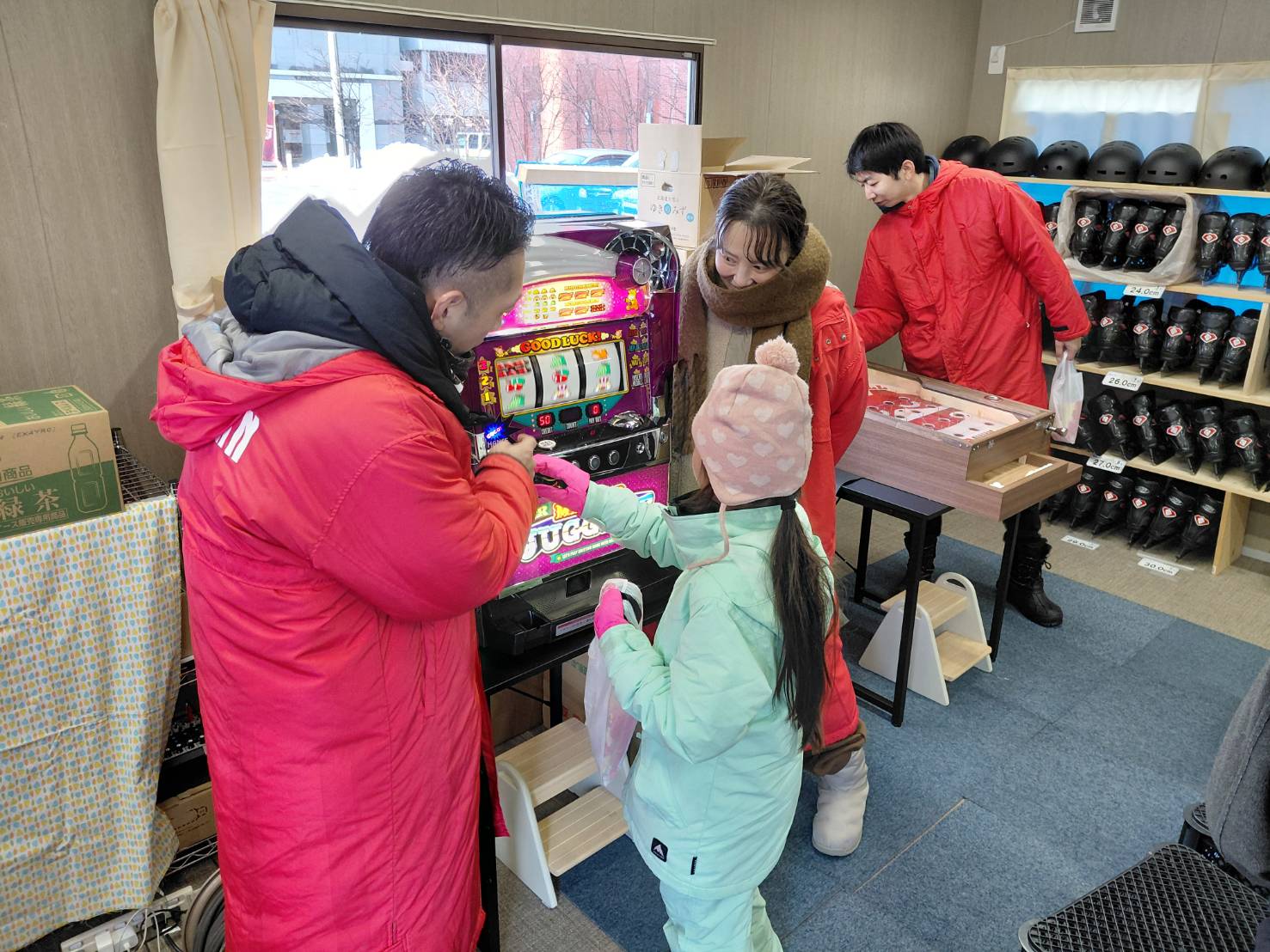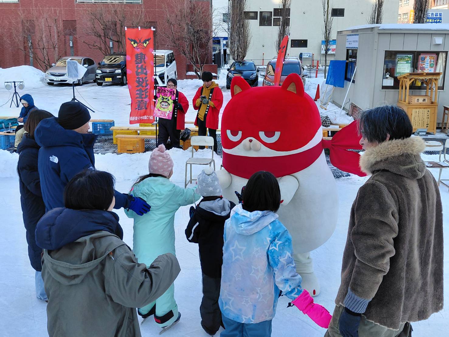 マルハンブースでは、スマートボールやスロット体験を実施し、参加された方へお菓子の配布を行いました。スケートを楽しむ合間に立ち寄る方も多く、子どもから大人まで幅広い世代の方に楽しんでいただきました。また、マルハン公式キャラクター「にゃんまる」も登場し、会場では写真撮影や交流の輪が広がりました。スケートを滑りながらにゃんまるに手を振るお子さまの姿も見られ、冬のイベントならではのあたたかな光景が広がっていました。さらに、イベント運営に関わる地域の方々や企業の皆さまと交流する中で、今後のイベント開催に関する新たなご提案をいただくなど、地域とのつながりを深める機会にもなりました。