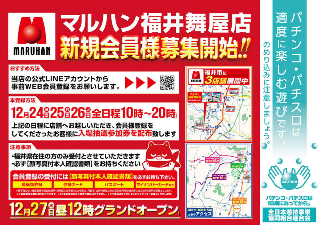 2023年12月27日、福井県に4店鋪目となる「マルハン福井舞屋店」がグランドオープンします。オープン日時や事前会員募集、ここだけの店鋪情報を紹介していきます。