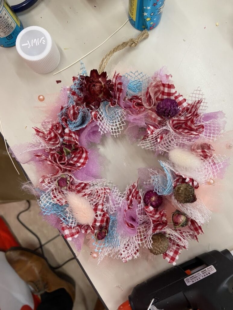 お子さまたちには、リース作りを楽しみながら環境について考えるきっかけを提供するとともに、美しく仕上がったリースをお持ち帰りいただけました。