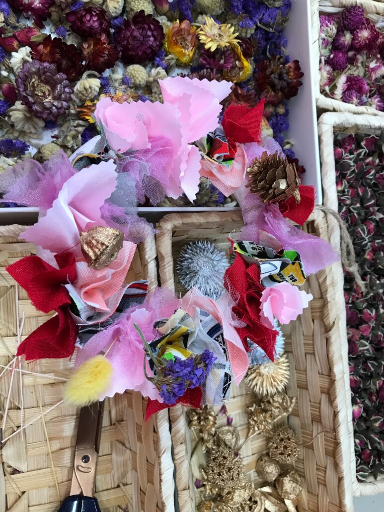 今回のイベントでは「環境」をテーマに掲げ、リースのメイン素材に布の端材を使用しました。さらに、松ぼっくりやどんぐりなど、装飾品にも自然素材を徹底的にこだわりました。