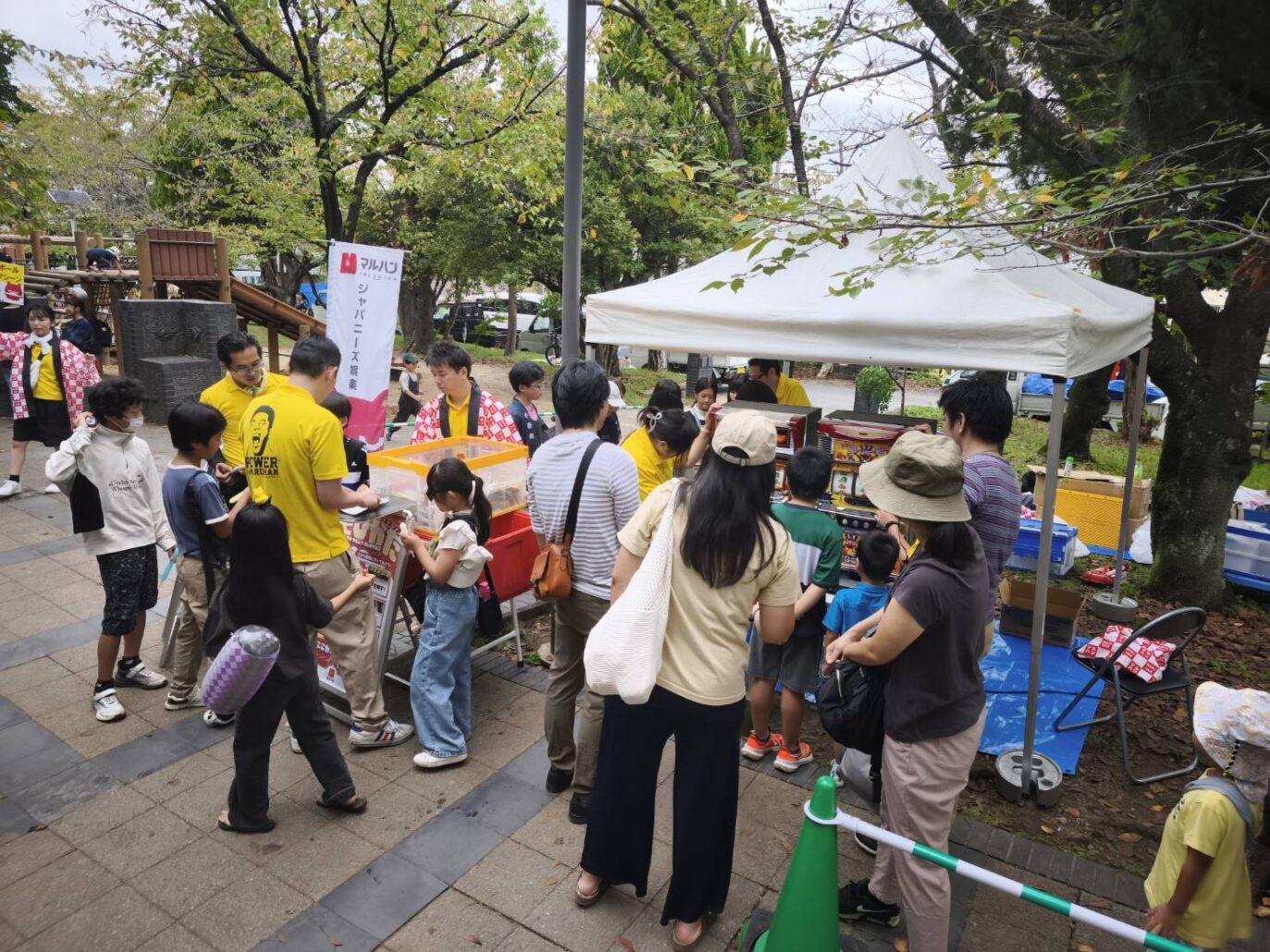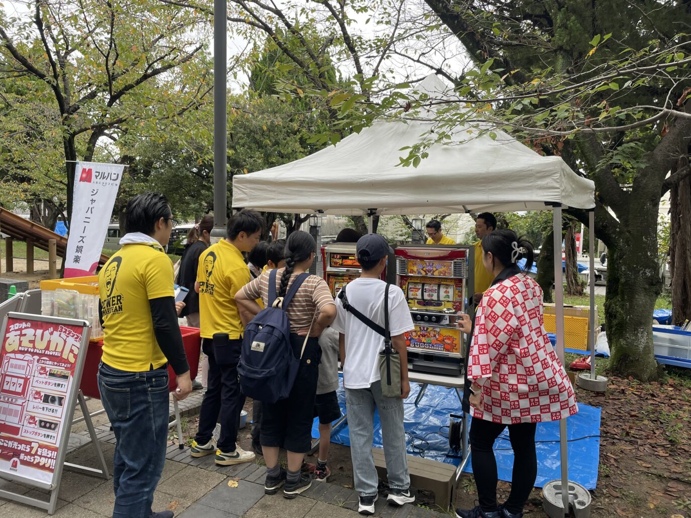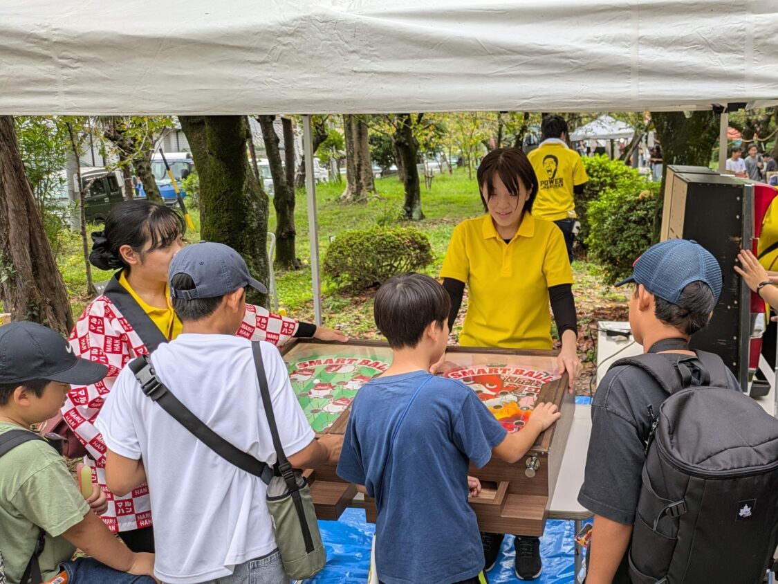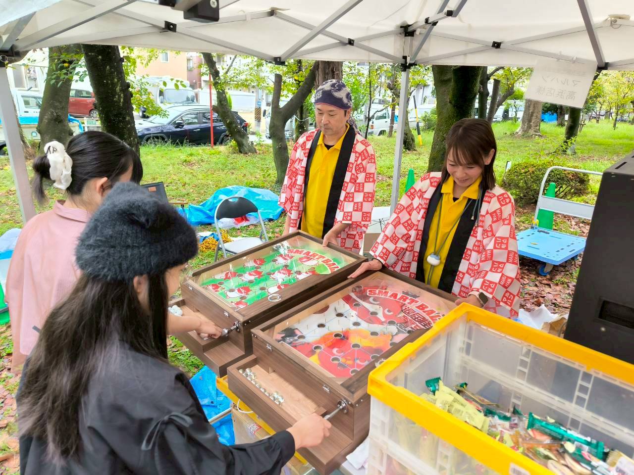 マルハンのスタッフは、2日間にわたりブースの設営と運営に携わりました。スマートボールやスロットの設置、景品のお菓子配布などを行い、お祭りの盛り上がりをサポートしました。来場者の安全を配慮しながら、会場内の見回りやゴミ回収も行い、運営のお手伝いをしました。