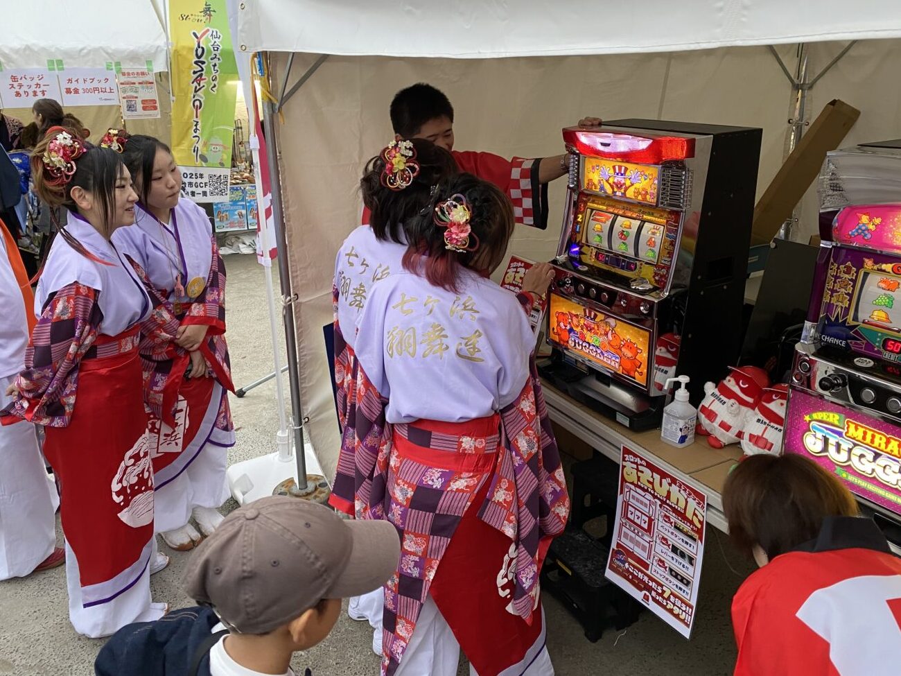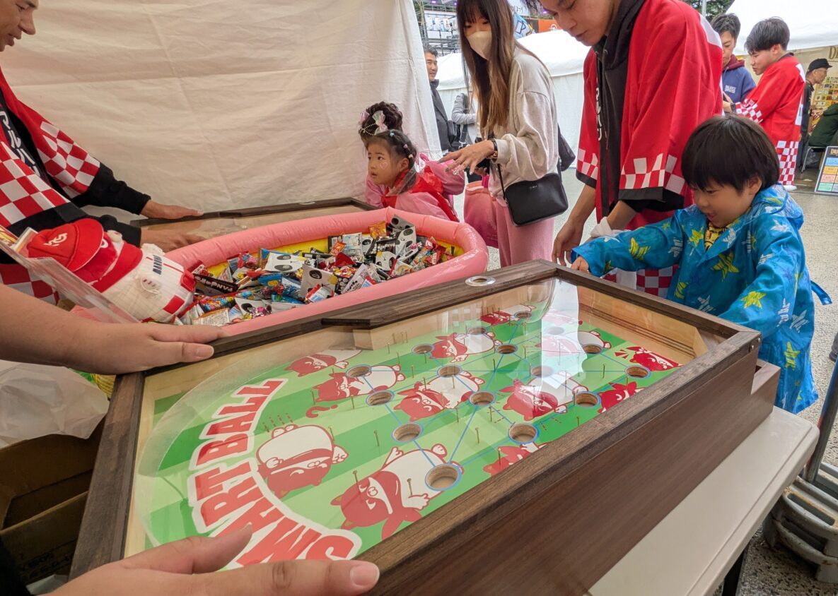 マルハンは、会場内にブースを設置し、スマートボールやスロット機を無料で体験できるスペースをご提供しました。遊技体験の後には参加賞としてお菓子を配布し、子ども連れのご家族や若者を中心に多くの方が立ち寄ってくださいました。また、祭り終了後にはゴミ拾い活動も実施し、地域の清掃活動にも積極的に参加しました。