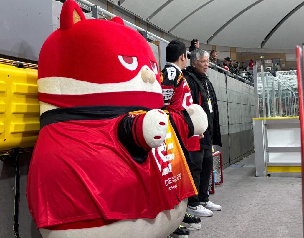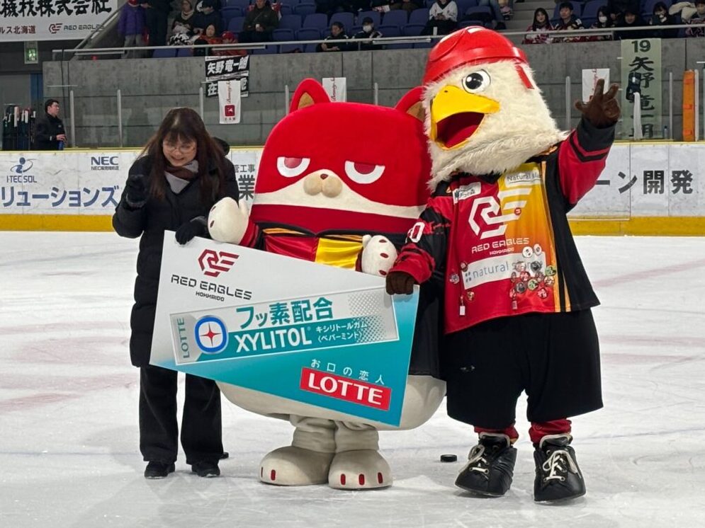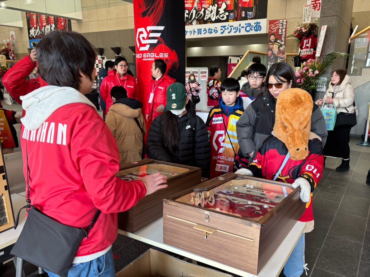 今回の試合は、東アジア唯一のプロアイスホッケーリーグに参戦する苫小牧市のプロチーム、レッドイーグルス北海道のシーズン最終戦。会場には約2,000名のファンが集まり、ブース出展を通じてマルハンの取り組みも広く紹介されました。苫小牧駅前店から参加したスタッフ7名は、朝10時半の搬入からブース準備、試合終了後の片付けまで一日を通して対応しました。