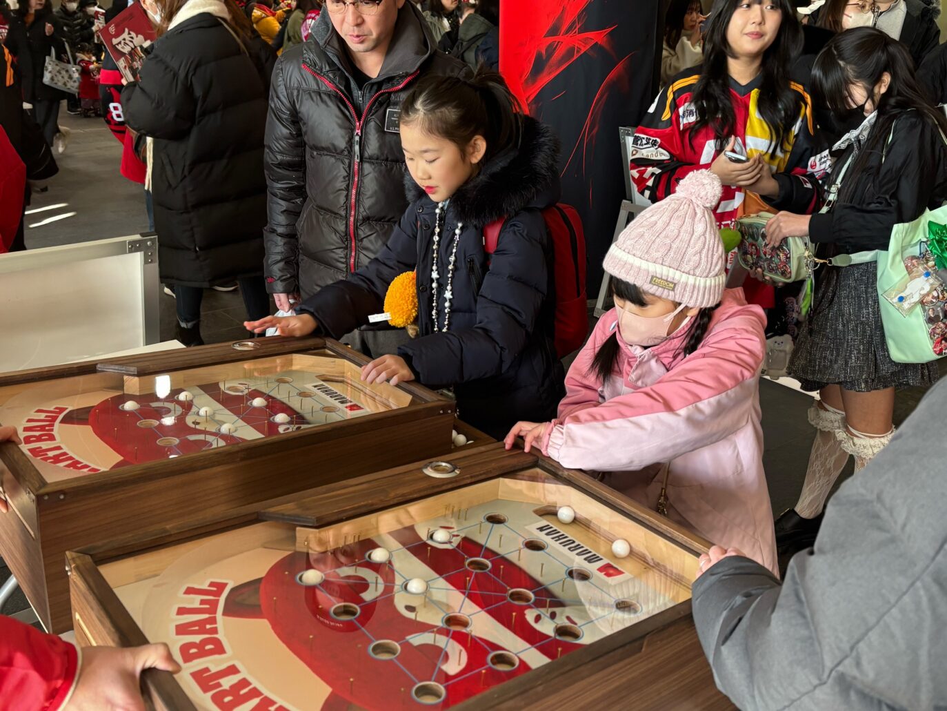 正午の入場開始とともにマルハンブースもスタートし、スマートボールやスロット体験、公式キャラクター「にゃんまる」とのふれあいやノベルティ配布などを実施。試合前から会場を訪れる親子連れやファンの方々がブースに足を運び、にぎやかな交流の場となりました。