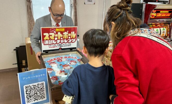 イベント開始直後から、多くの親子連れがブースに足を運んでくださり、スロットやスマートボールを楽しむ姿が見られました。「初めて触る」というお子さまも多く、保護者の方と一緒に遊びながら、笑顔が自然と広がっていく様子が印象的でした。