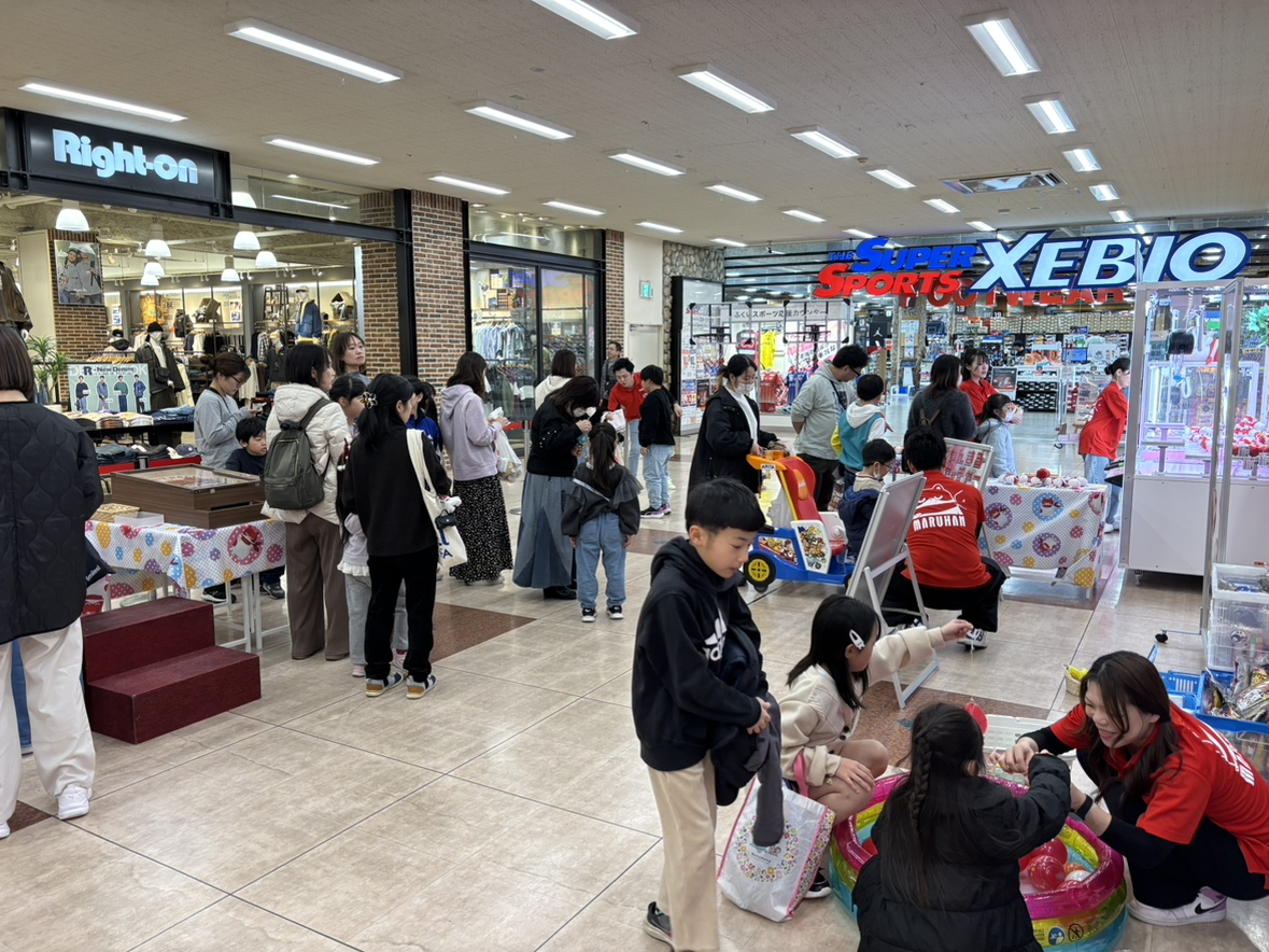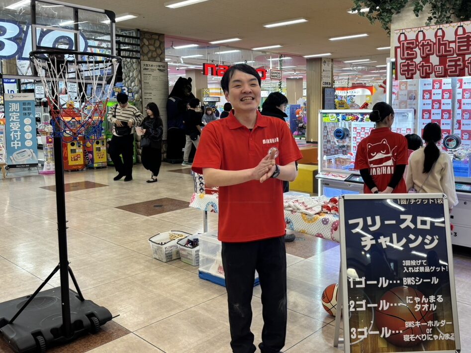 今回のイベントは、マルハン公式キャラクター「にゃんまる」の誕生日をお祝いする企画として開催しました。縁日をイメージした射的やヨーヨーすくい、UFOキャッチャーに加え、ジャパニーズ娯楽の要素としてスマートボール体験を実施。さらに、BWS様とのコラボ企画としてフリースローチャレンジも行いました。会場となったアピタ福井大和田店には多くの家族連れが訪れ、福井大和田店・福井店・福井舞屋店のスタッフが連携して運営を行いました。来場者数は約350名にのぼり、終日多くの方にご参加いただきました。